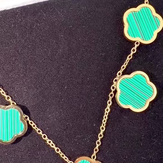 Entdecke unser elegantes Tréfle Set in edlem Grün mit goldener Fassung. Das Set besteht aus einer zarten Halskette mit Kleeblatt-Anhängern, einem passenden Armband und stilvollen Ohrsteckern.