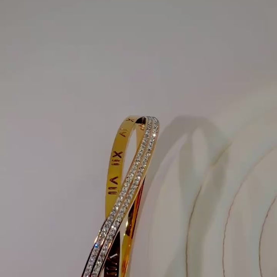 Entdecke unseren luxuriösen Infinity Armreif mit verschlungenem Design und funkelnden Kristallsteinen in Gold. Ein Symbol für Unendlichkeit und ewige Eleganz.