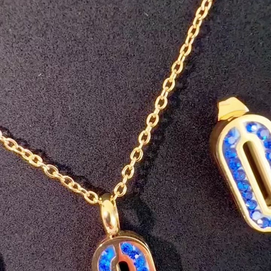 Entdecke unser exquisites Sapphire Set in tiefem Blau mit goldener Fassung. Das Set besteht aus einer eleganten Halskette mit länglichem Anhänger und passenden Ohrringen, beide mit funkelnden blauen Kristallsteinen besetzt.